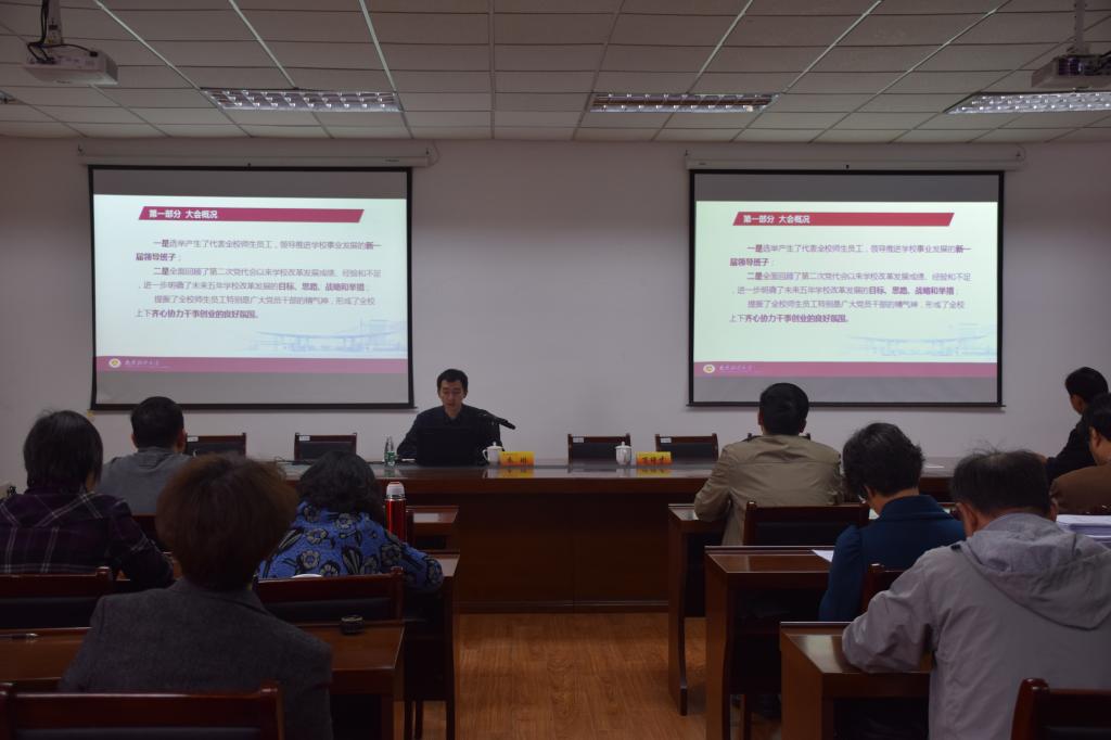 衣琳同志简单介绍了大会概况,接着从五年来的工作回顾、发展目标和思路、今后五年的主要工作和全面加强党的建设四个方面对大会报告进行了全面的解读。最后衣琳同志就如何贯彻落实大会精神提出了具体的目标和任务。希望学院全体教职工保持强烈的使命感、责任感和紧迫感,确保学校各项决策真正落到实处。