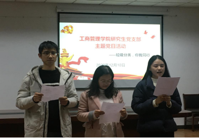 2020年12月10日,研究生党支部在德济楼408开展了“垃圾分类 你我同行”主题党日活动。活动由宣传委员周婷同志主持,支部全体党员参加此次活动。