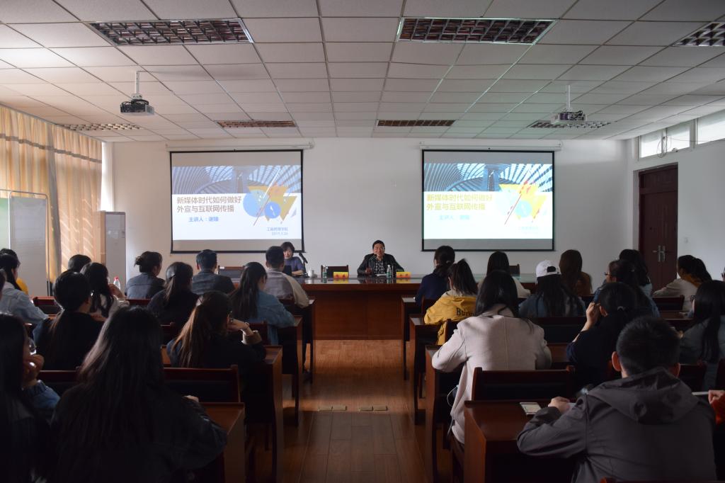 谢臻主任首先介绍了当前时代背景及新闻大环境,鼓励大家在移动优先的时代主动出击,创新传播。然后,她结合自身实际工作经历,建议同学们结合社会热点、时事重点策划校园活动,站在受众的角度,找到情感共鸣点,提高传媒互动性。再次,她强调了抓好时代机遇、做好自我推广、注重新闻内容、标题取胜这四项关键能力的重要性,并希望同学们能够传播正能量,守住网络底线,营造良好的传媒环境。最后杨华副书记做了小结。