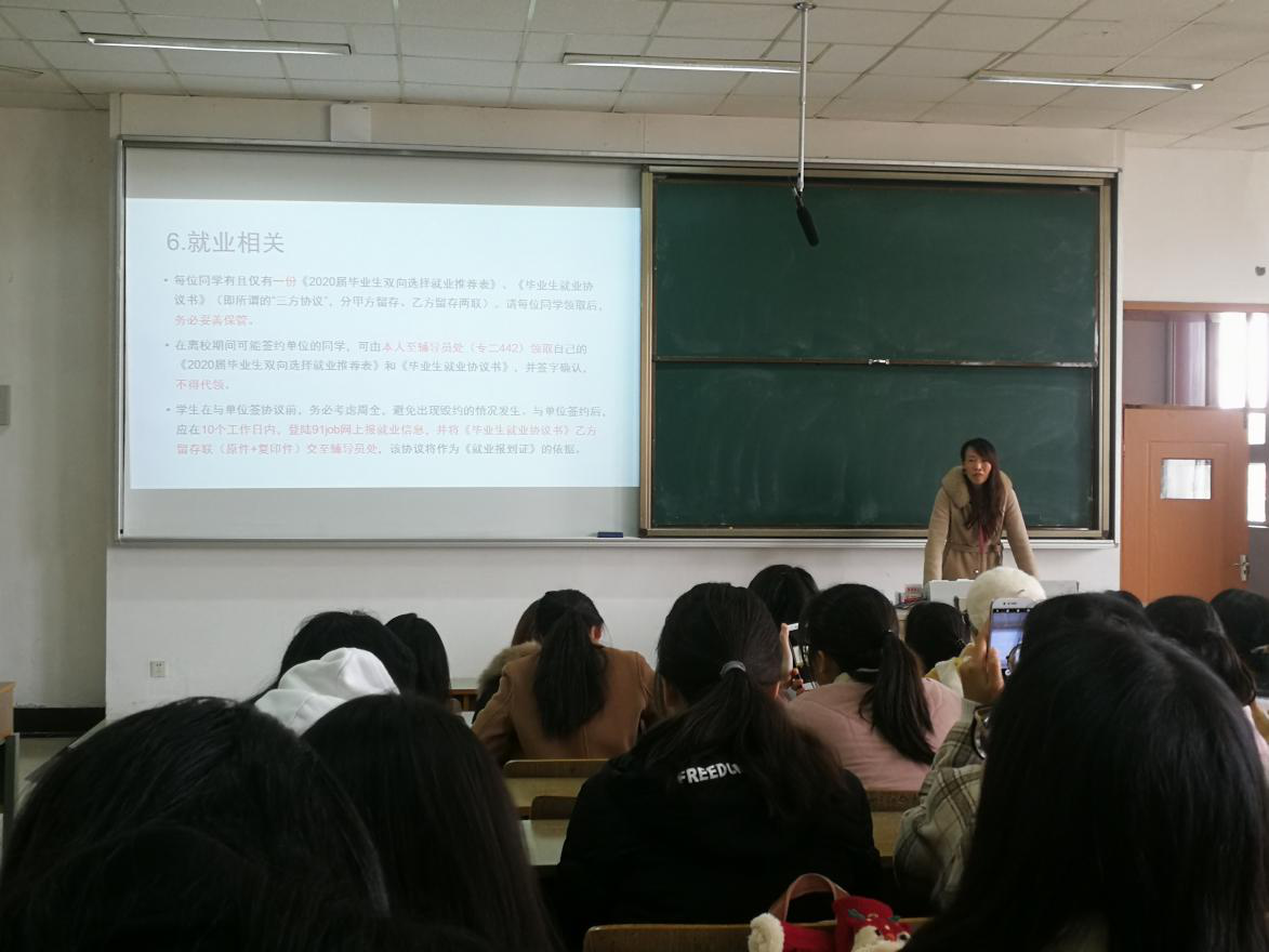 2019年11月26日,william威廉中文毕业班辅导员冯玲老师在博远楼210教室召开了实习就业动员大会,2020届本科全体学生参加此次会议。