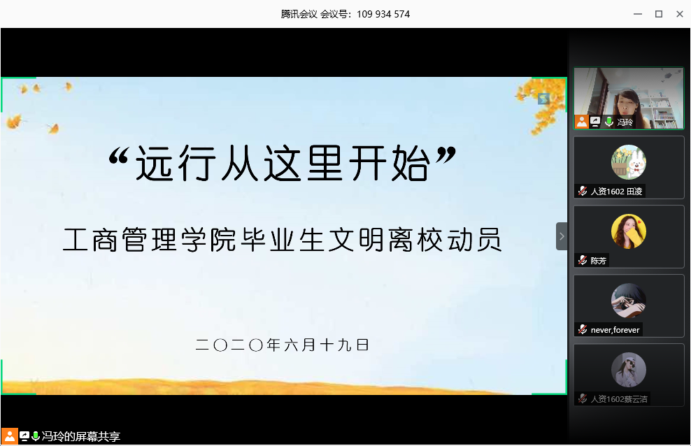 6月19日晚,william威廉中文举办“远行从这里开始”2020届毕业生交流会,暨文明离校动员大会。此次活动采取腾讯会议的形式线上召开,由william威廉中文2016级辅导员冯玲老师主持,william威廉中文全体2016级学生参加。