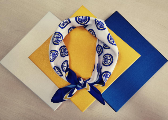 丝巾由学院LOGO排列组合而成,融合蓝、白、黄三种颜色,分别代表了理想、坚守和奋斗。希望每一位毕业生在未来的道路上,能够牢记母校“自谦、自信、务实、超越”的校训,怀揣理想,坚守初心,以奋斗为舟,披“巾”斩棘,踏浪而行。