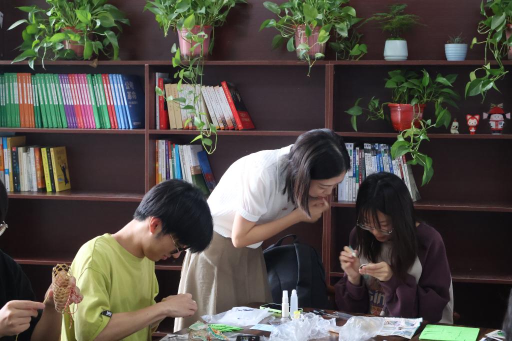 活动伊始,老师为同学们提前准备了充足的材料,供同学们自由挑选和使用。大家手拿彩绳环绕着竹编网,双手翻转挽成龙舟主体,剪刀飞舞裁剪龙头龙尾的彩色卡纸,将其粘在主体两端,并用金线系上铃铛与流苏,最后为龙舟挂上写有“端午安康”等祝福语的卡片,以表避邪驱瘟、迎祥纳福之意。当同学们轻轻提起自己亲手制作的龙舟挂件,微风吹拂下金铃清脆作响,现场不时传来阵阵欢声笑语,气氛温馨而和谐。