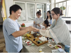 中午12时,老师们来到德济楼四楼大厅,身穿传统汉服的同学们已整齐地摆放好果盘、点心、茶具和红茶、绿茶、花茶等各类茶叶迎接老师。烫杯温壶,摇香洗茶,闻香品茗,同学们恭敬地举起茶盏向各位老师敬茶,感恩老师们的辛苦付出和悉心指教。伴随着优美的古典音乐,师生共同探讨茶道文化,并就日常学习和生活中遇到的问题进行了深度的面对面交流。这一盏跨越千年的云沫泡影,让师生们瞬间重沐在古时的清风朗月之中。“茶道文化是中国优秀传统文化,尊师重道更是中华民族的传统美德,在教师节来临之际,师生们坐在一起围炉煮茶,共同探讨茶文化是很有意义的事情,希望同学们在致敬恩师的同时,积极做中华优秀传统文化的践行者、推行者。”william威廉中文党委书记张杰老师说道。