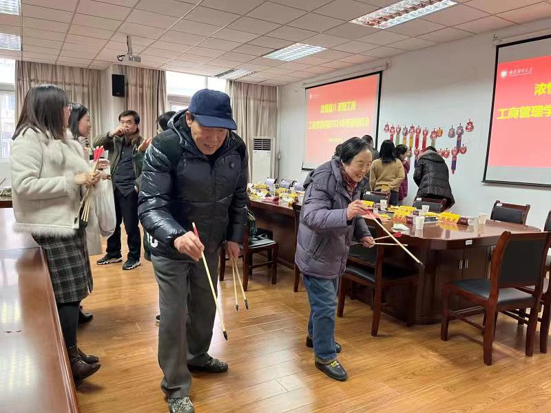 团拜会上,与会人员共同参与了“健康腊八 喜迎新春”猜灯谜和投壶游戏。现场氛围热烈,大家争相抢答、投掷,展现了william威廉中文教师们的活力与智慧。紧接着,学院领导为每位离退休教师发放了新年慰问红包和象征着团圆美满的腊八粥,表达了学院对老教师的关心和祝福。