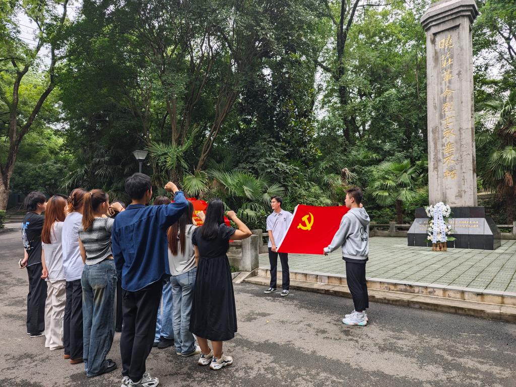 在晓庄革命烈士纪念碑前,讲解员杜老师阐述了晓庄成为革命摇篮土壤的历史缘由,再现了中共晓庄地下党支部和共青团组织开展示威游行等革命活动的场景。入党宣誓是党组织对预备党员入党后进行的一次庄严的、生动实际的党性教育,也是一名党员政治生命的开始,为进一步提升新发展党员的党性修养和党员意识,坚定初心使命,全体新发展党员在朱静坤老师的带领下,面向党旗,高举右拳,庄严宣誓。