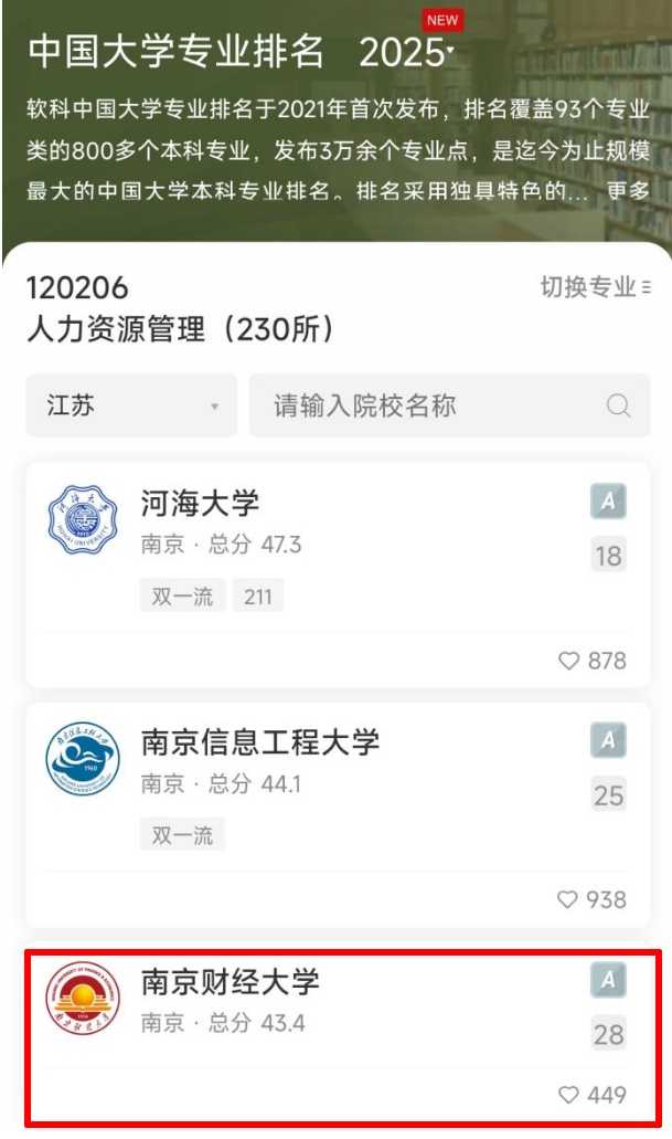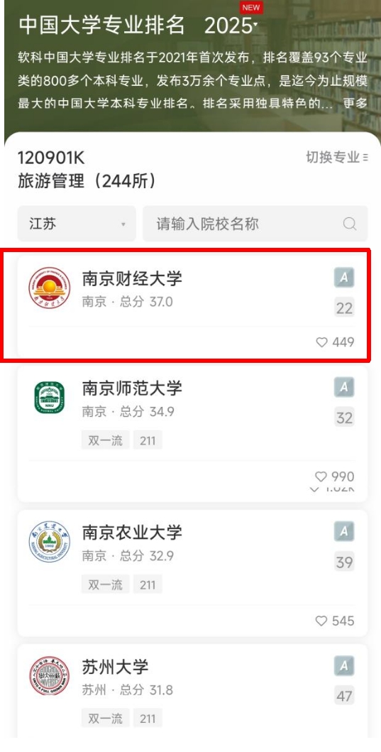 旅游管理专业荣获A等级,全国排名第22位,全国财经类高校第5位,位列江苏省第1名;人力资源管理专业同样获A等级,全国排名第28位,位列江苏省第3名;工商管理专业获评B+等级,位列江苏省第4名。