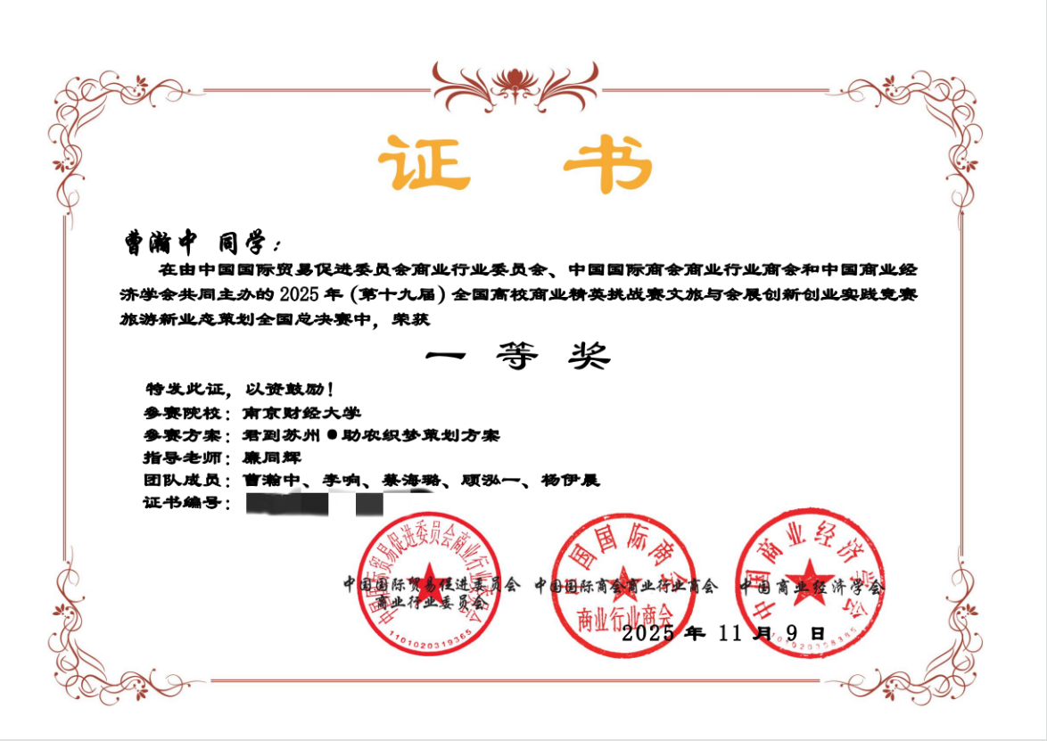 2025年11月,由中国国际贸易促进委员会商业行业委员会、中国国际商会商业行业商会、中国商业经济学会等机构共同主办的全国高校商业精英挑战赛文旅与会展创新创业实践竞赛旅游新业态策划全国总决赛成功举办,我院荣获本科组全国一等奖1项和二等奖2项。