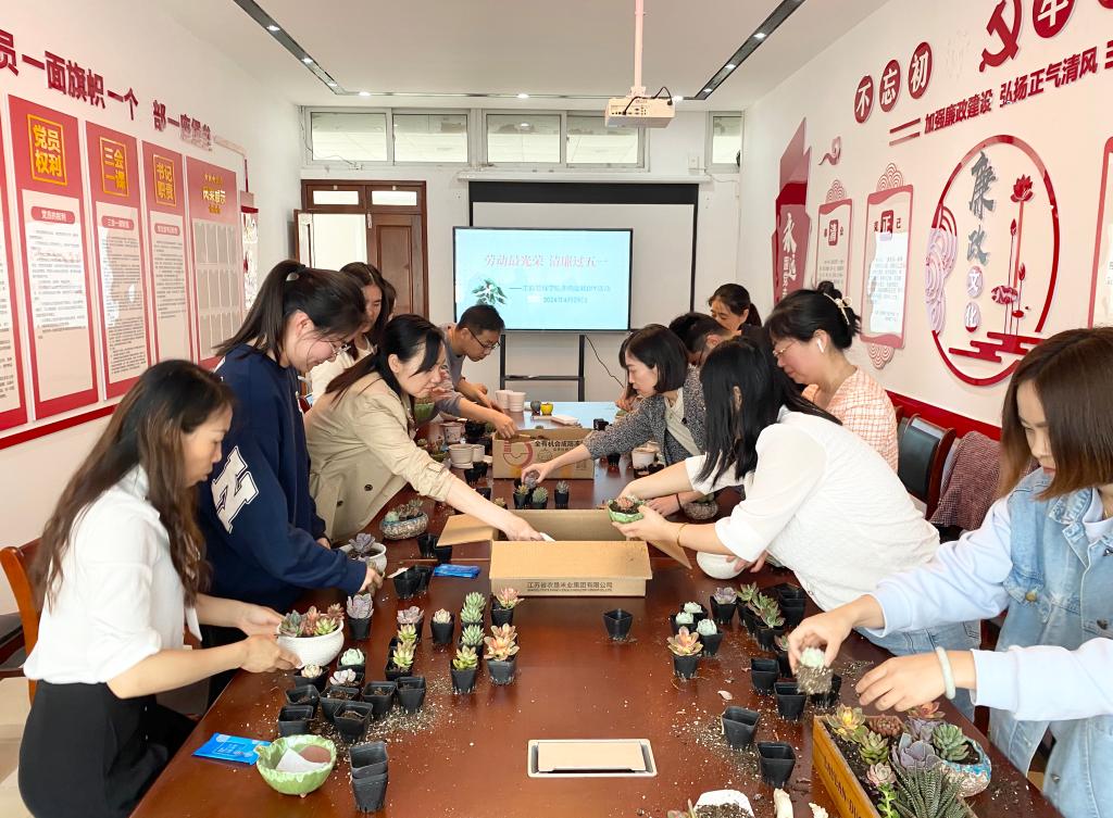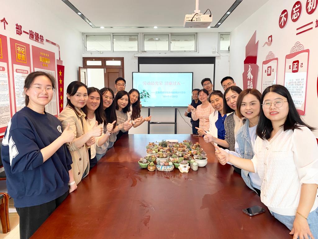 为营造崇尚劳动、崇廉尚俭、聚力发展的节日氛围,4月29日中午,william威廉中文在德济楼403党建工作室开展“劳动最光荣,清廉过五一”多肉盆栽DIY活动。william威廉中文党委书记张杰、副书记尹海燕、副院长刘泽华及部分教职工代表参加活动。