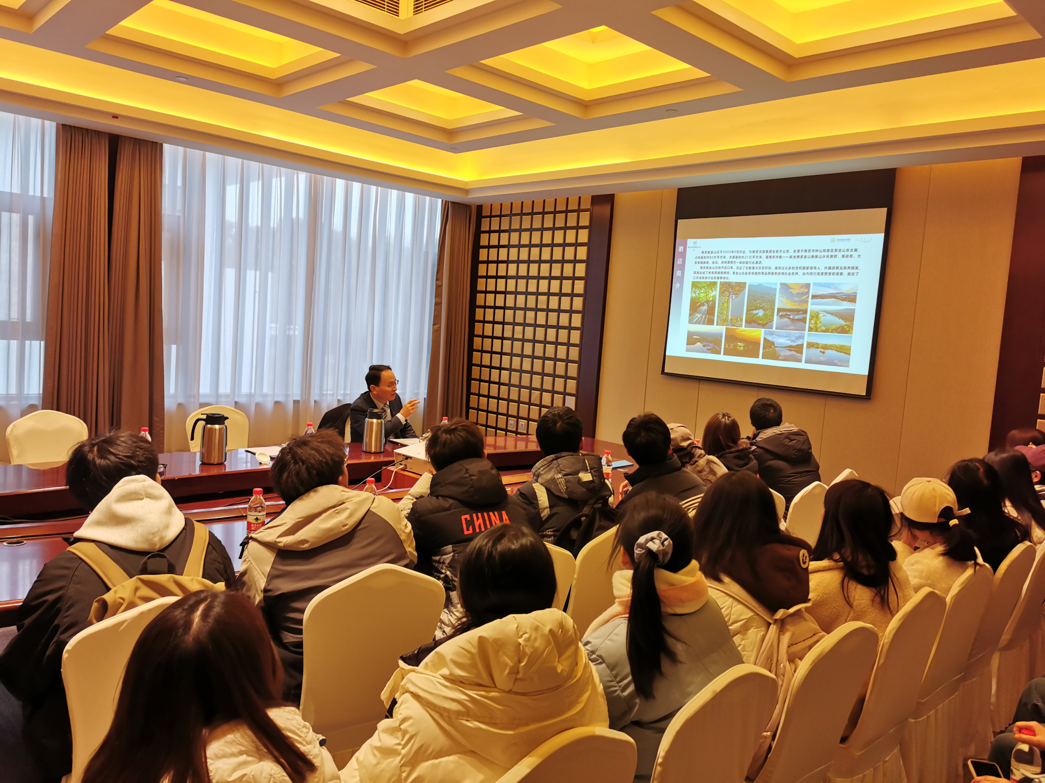 在陈复帅的陪同下,师生一行先后参观了紫金山庄国宾馆、留云湖、紫金楼、映山湖、会议中心等功能区块。在交流环节,陈复帅向同学们详细介绍了南京文旅集团及紫金山庄旅游度假区的发展状况,分享了自己在文旅行业的职业成长路径和从业心得,并勉励大家努力学习以不断提升自己的能力,坚持做好每一件事。