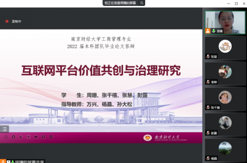 首先,秦伟平教授说明了答辩流程和要求;接着,我院本科论文团队项目的队长周珊同学从选题依据、团队合作、研究思路、主要结论与创新点五个方面进行详细汇报。周珊、张千禧、张慧与彭露四位同学合作研究的论文方向为互联网平台价值共创与治理研究,探究在平台、企业、消费者等主体共存的生态系统中,如何有效实现数据赋能与价值共创、如何应对消费者行为、如何实现企业绩效与平台治理共赢等问题。