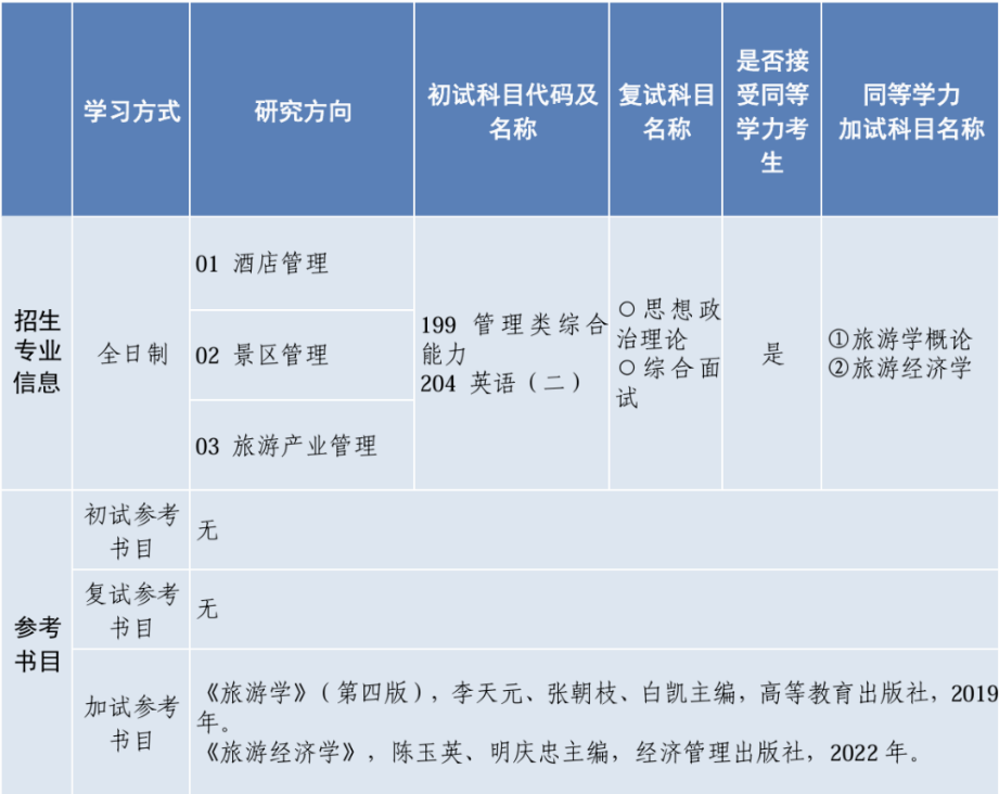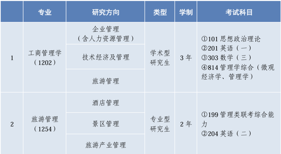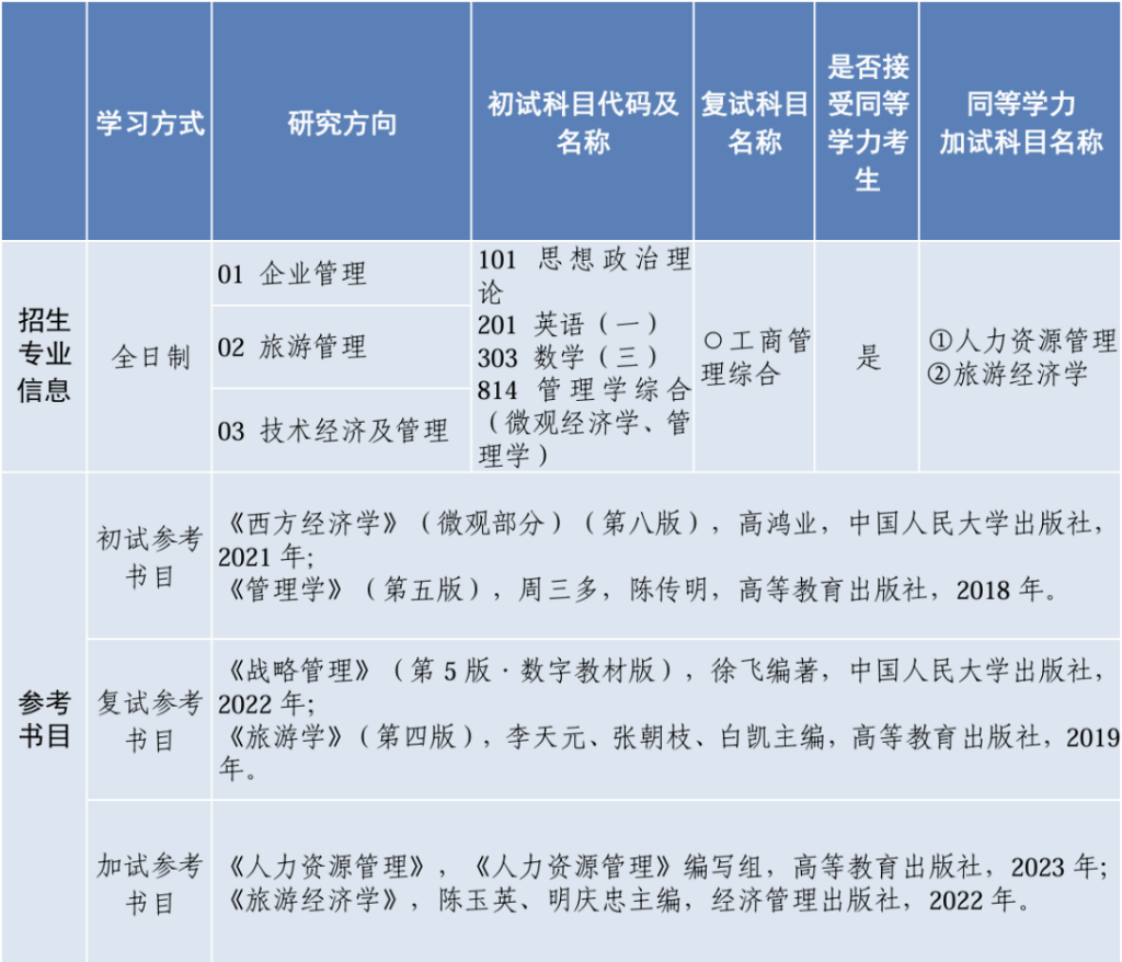 工商管理学一级学科硕士学位授权点开设企业管理(含人力资源管理)、旅游管理、技术经济及管理三个研究方向。