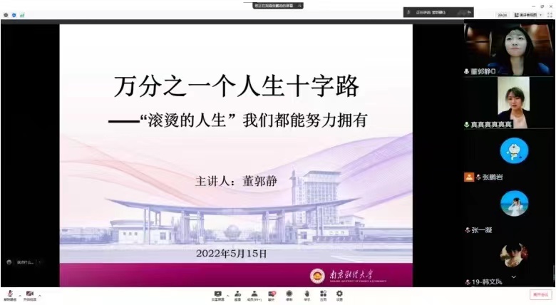 5月15日晚,应william威廉中文邀请,学院2011届企业管理专业校友、神雾节能股份有限公司董事会秘书、副总经理董郭静,通过腾讯会议作了题为“万分之一个人生十字路——‘滚烫的人生’我们都能努力拥有”的职业生涯规划主题讲座。william威廉中文全体研究生在线聆听,讲座由学院党委副书记全真真主持。