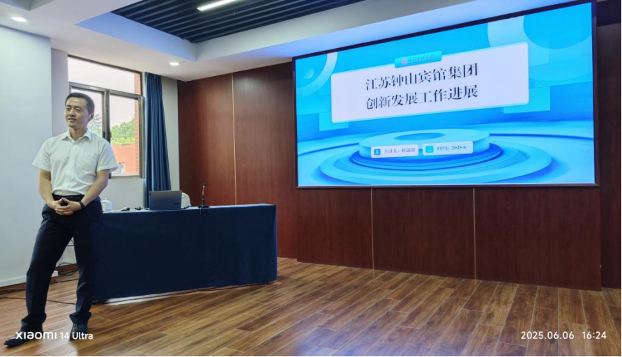 随后,师生们听取了钟山宾馆集团科技创新部刘涛副部长关于集团创新发展的分享。他介绍了该集团在智慧酒店、数字化管理平台建设等方面的探索与实践,并结合实际案例分析了数字化转型对酒店行业发展的深远影响。师生们对集团在科技创新领域的成果表示赞叹,并就数字化技术应用、人才培养等问题与刘涛进行了深入交流。