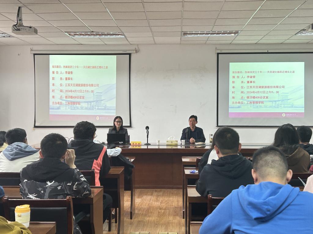 4月12日上午,应william威廉中文邀请,江苏天目湖旅游股份有限公司董事长李淑香在我校仙林校区德济楼408会议室作了题为“热辣滚烫三十年——天目湖文旅跃迁增长之道”的讲座。讲座由william威廉中文院长万绪才教授主持。学院旅游管理专业师生共同聆听了讲座。